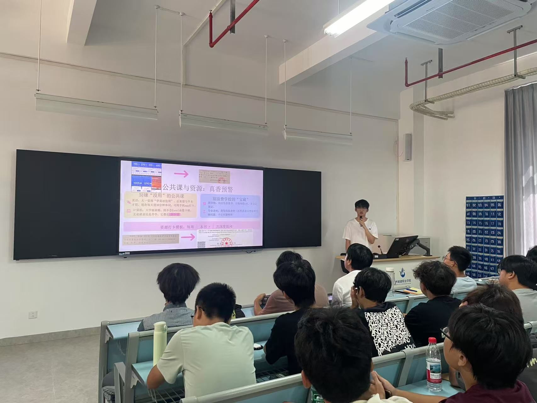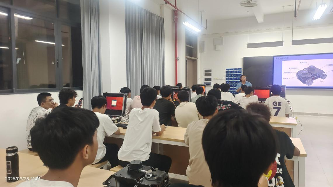 榜样的力量是无穷的,在2025年广东省老员工计算机视觉大赛的“AI视觉应用创新挑战赛(本科组)”中荣获一等奖的团队成员黄阿茵学姐、刘少博学长亲临现场,分享其“人员跌倒检测系统”的开发心得与参赛历程。“从大一的懵懂好奇,到如今的赛场夺奖,是学院提供的优质平台和老师的悉心指导,让我们不断成长。希望学弟学妹们珍惜资源,勇于尝试和试错,在机器人领域找到属于自己的热爱与方向。”寄语学弟学妹们注重动手实践。梁家轩学长则从学习方法、竞赛避坑等实用角度,为新生提供参考。黄学姐的寄语与梁学长关于学习方法的分享,赢得了现场阵阵掌声,极大地激发了新生的学习热情。